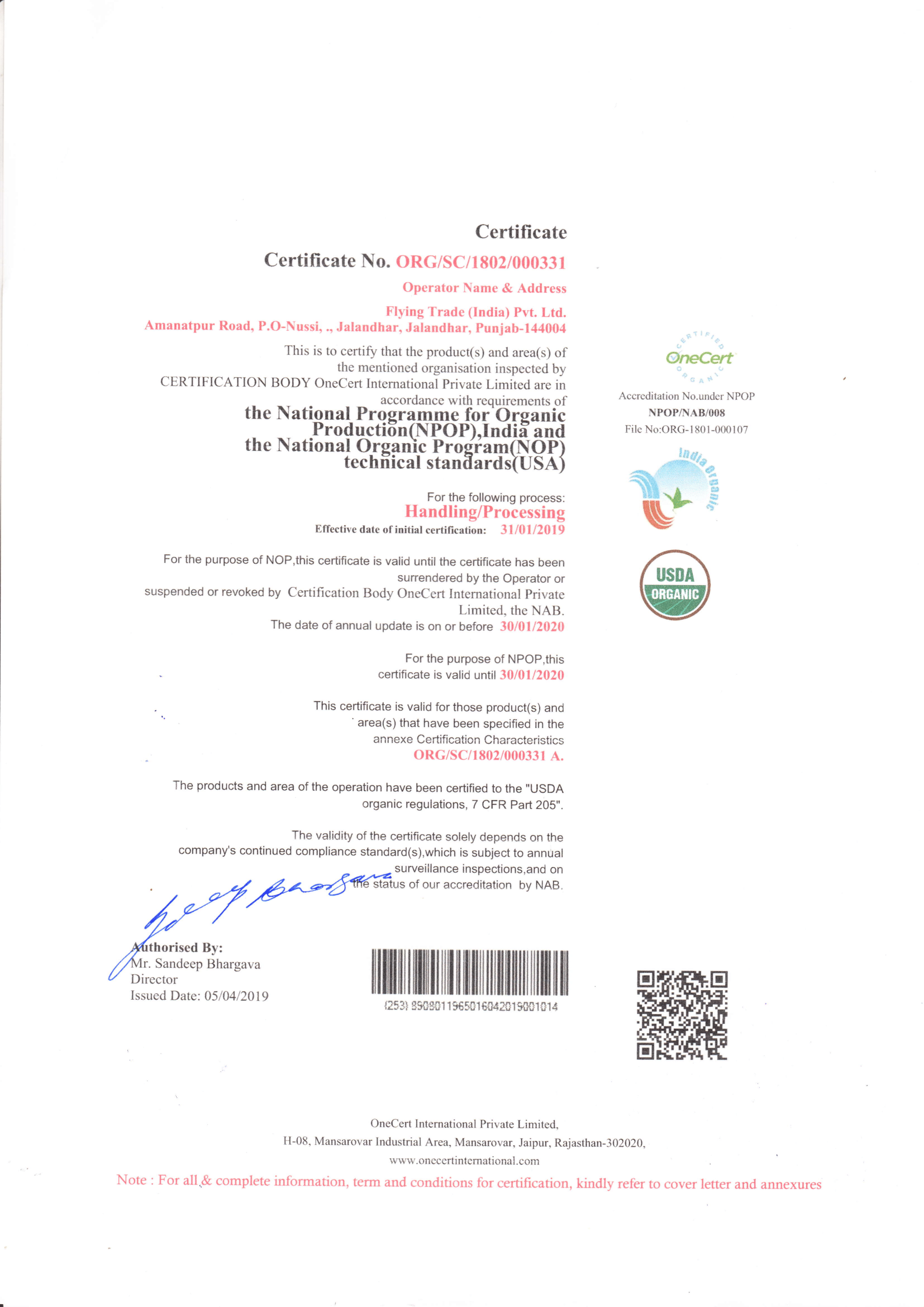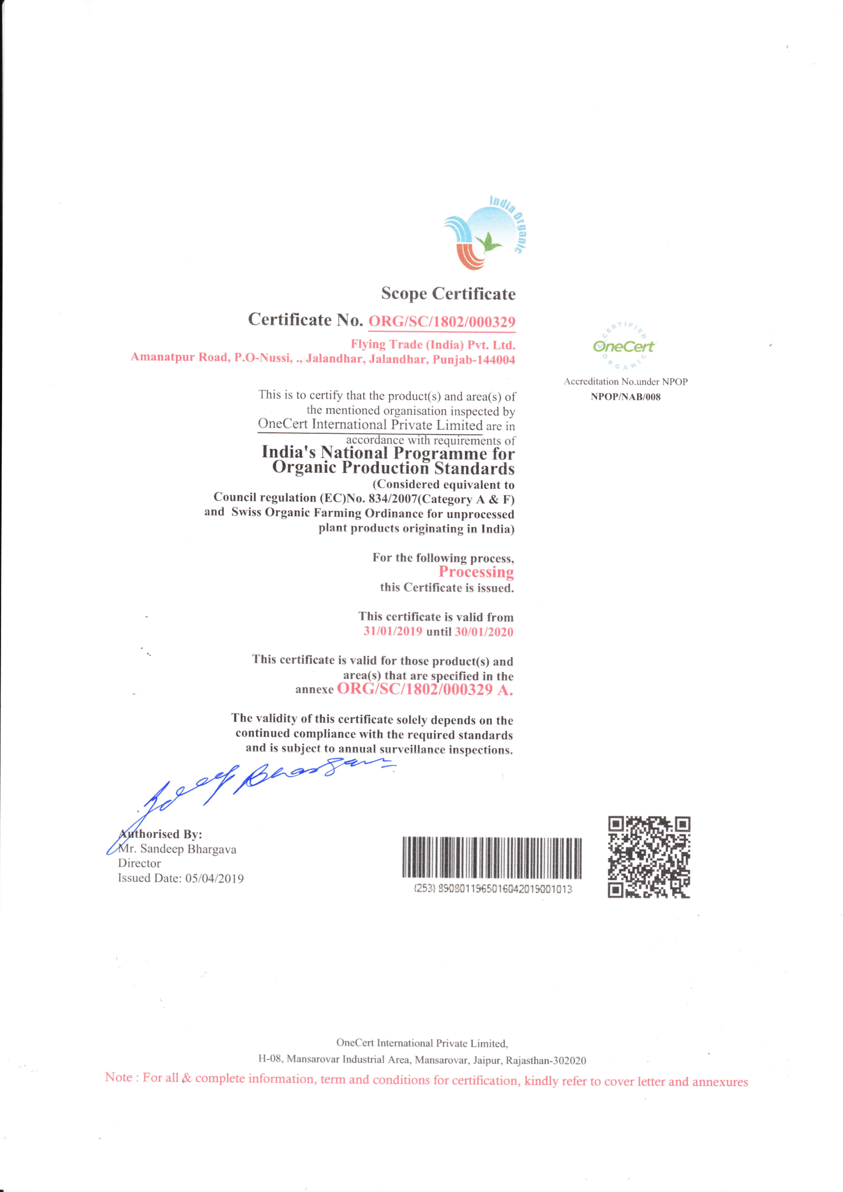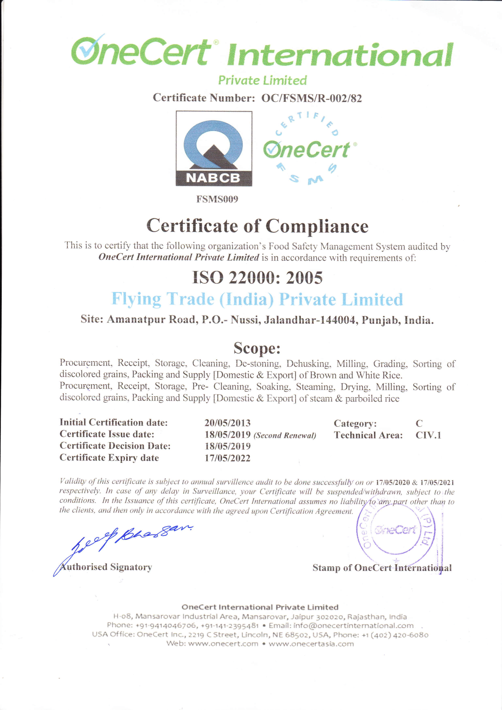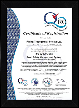 Flying Trade India Private Limited is certified with the internationally aligned Food Safety Management System, i.e ISO 22000:2005 and Food Safety Standard Authority of India (FSSAI).