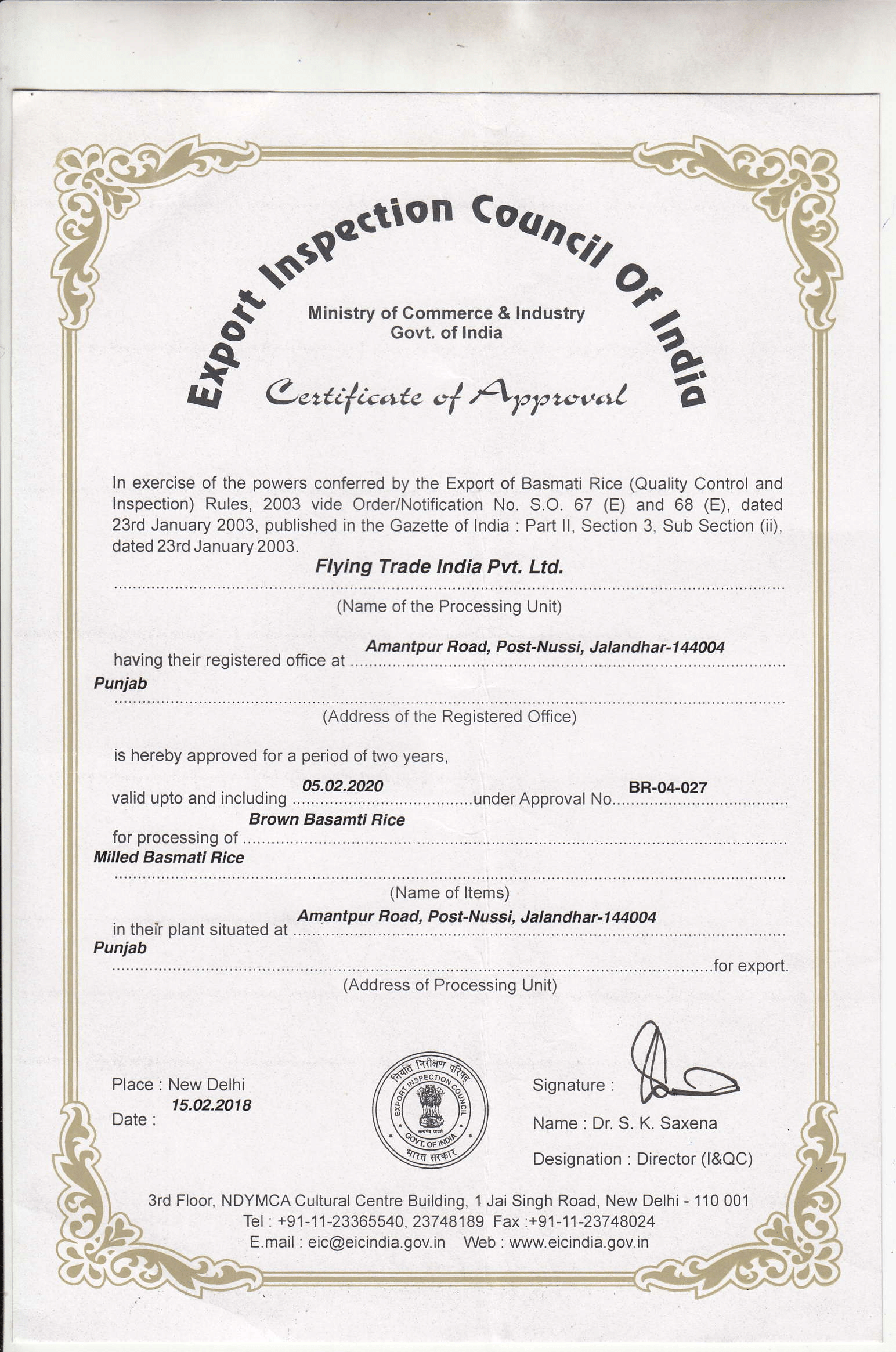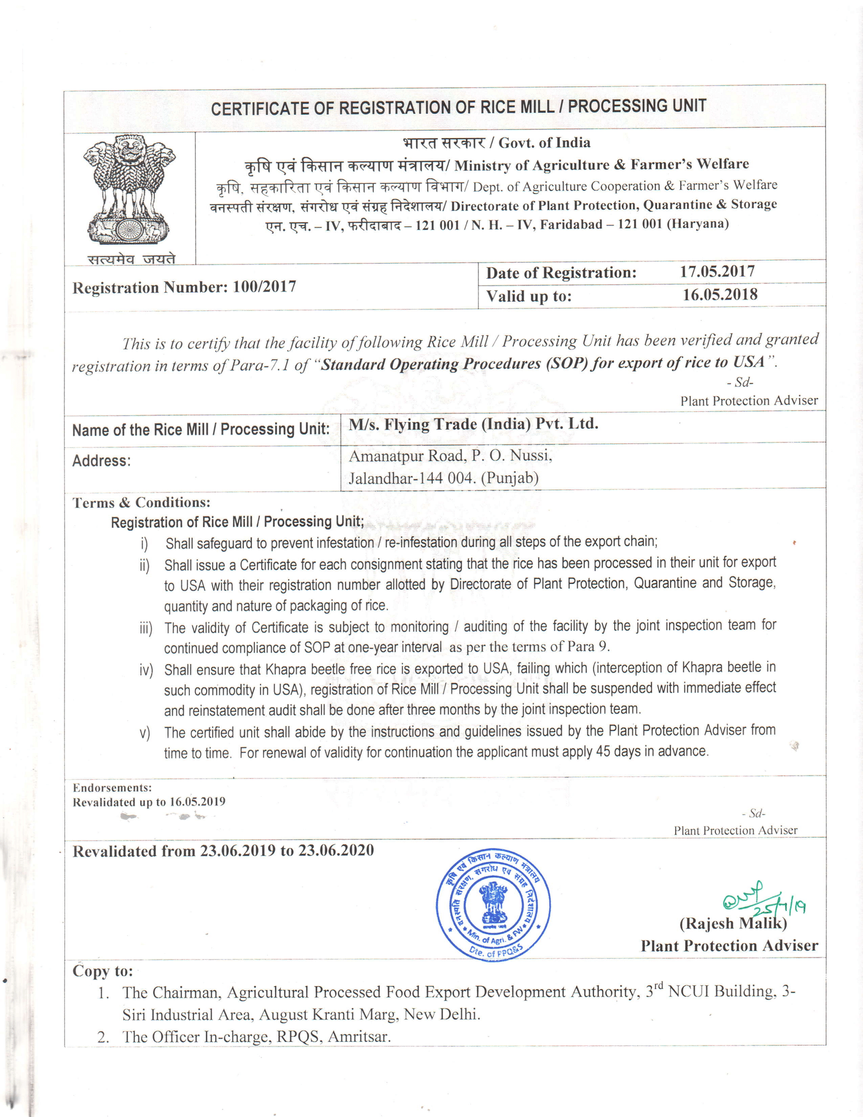Certificate of Registration of Rice Mill / Processing Unit - USA