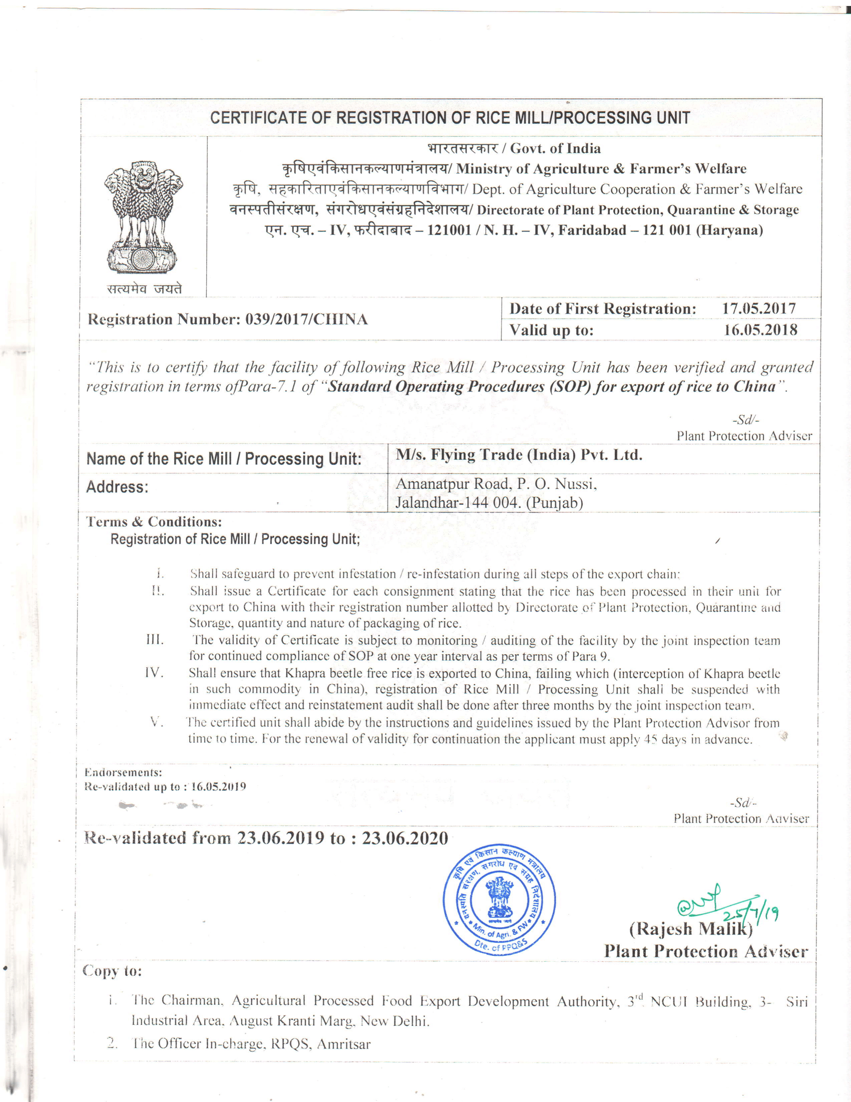 Certificate of Registration of Rice Mill / Processing Unit - CHINA