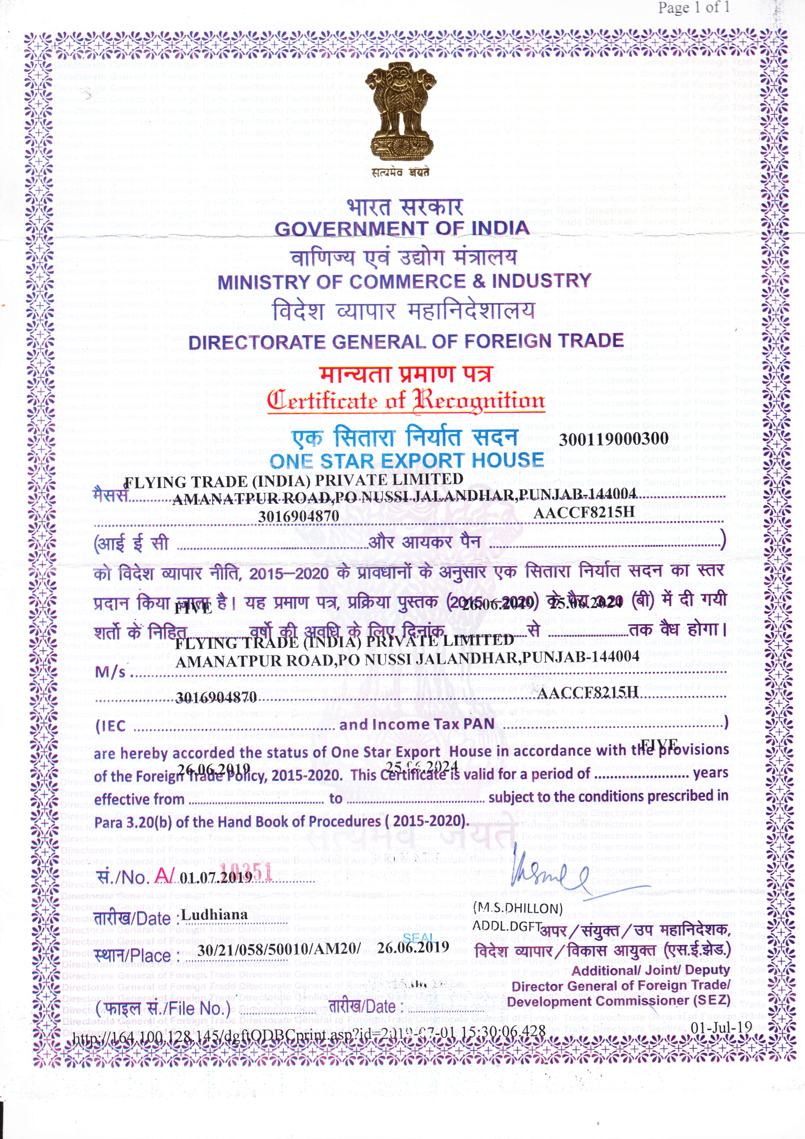 Star Export House Certificate